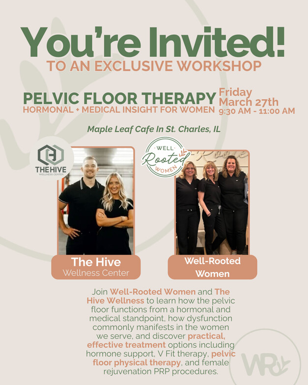 Join Well-Rooted Women and The Hive Wellness Center to learn how the pelvic floor functions from a hormonal and medical standpoint, how dysfunction commonly manifests in the women we serve, and discover practical, effective treatment options including hormone support, V Fit therapy, pelvic floor physical therapy, and female rejuvenation PRP procedures.